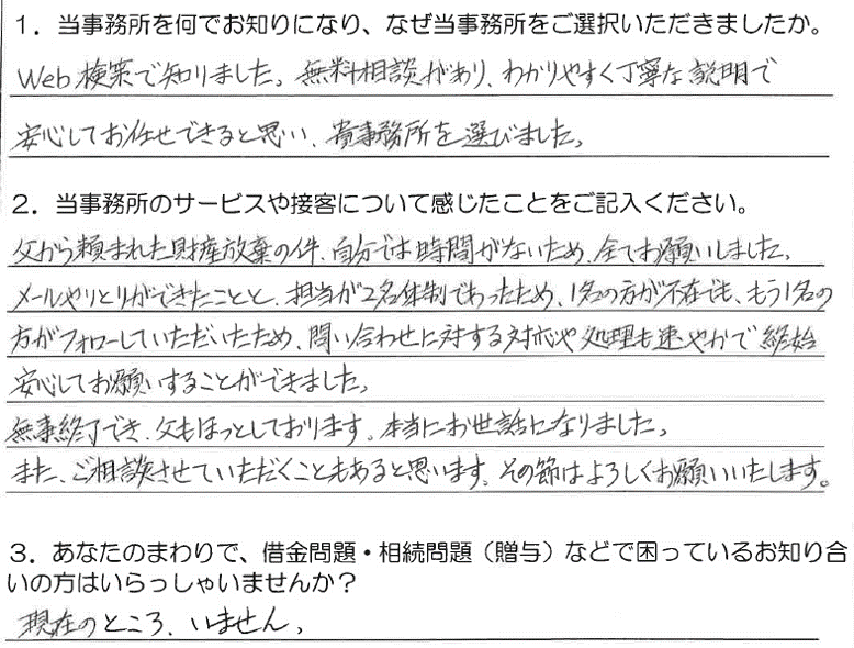 父から頼まれた財産放棄の件、自分では時間がないため、全てお願いしました。 メールやりとりができたことと、担当が2名体制であったため、1名の方が不在でも、もう1名の 方がフォローしていただいたため、問い合わせに対する対応や処理も速やかで終始 安心してお願いすることができました。 無事終了でき、父もほっとしております。本当にお世話になりました。 また、ご相談させていただくこともあると思います。その節はよろしくお願いいたします。