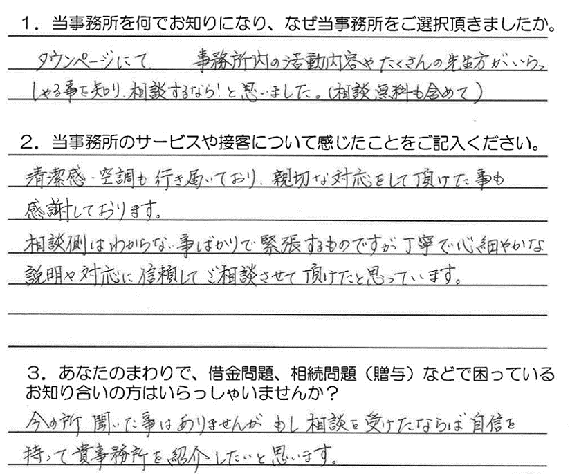 タウンページにて 事務所内の活動内容やたくさんの先生方がいらっ しゃる事を知り、相談するなら!と思いました。(相談無料も含めて)